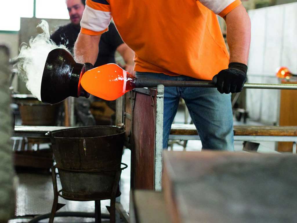 Il vetro, soffiato dal maestro vetraio all’interno della nella montatura di acciaio inox, si gonfia sagomandosi fino ad assumere la forma desiderata.