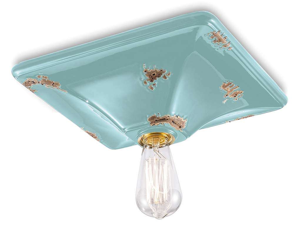 Plafoniera vintage, plafoniera stile industriale, plafoniera colorata, ideale come plafoniera ingresso o plafoniera camera da letto. Applique soffitto Vintage, realizzata in ceramica, dai colori brillanti e dalle forme lineari. Lo stile vissuto e anticato è ottenuto attraverso effetti di usura volutamente realizzati con tecniche artigianali e curati nei minimi dettagli.