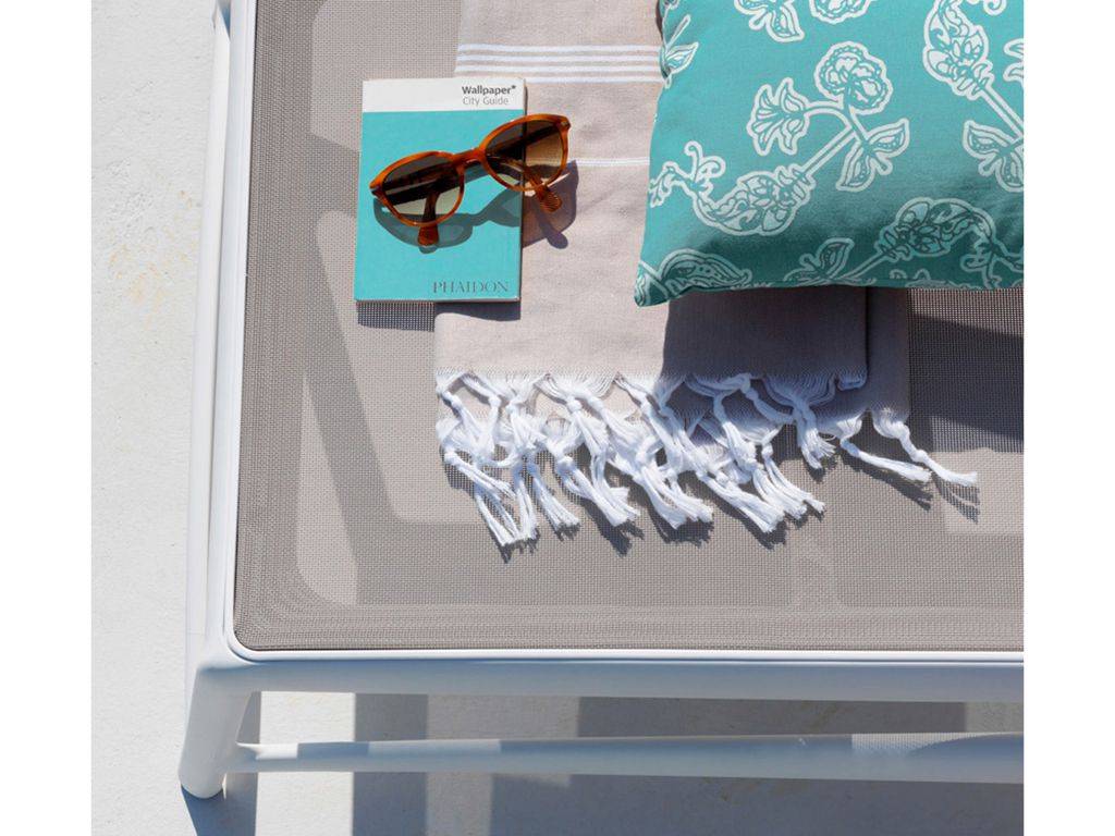 Lettino prendisole con struttura in polipropilene fiber glass ed interno in tessuto sintetico traspirante e ricambiabile.