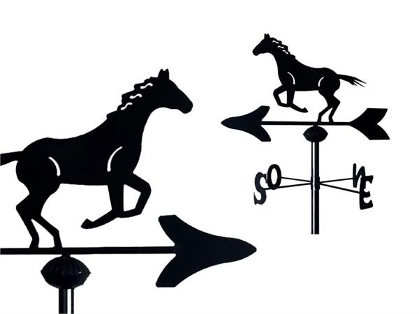Banderuola segnavento a forma di cavallo in ferro battuto, realizzata a mano in Italia. Completa di freccia e punti cardinali, è un oggetto d'arredo da esterni perfetto per decorare la tua casa o il tuo giardino.