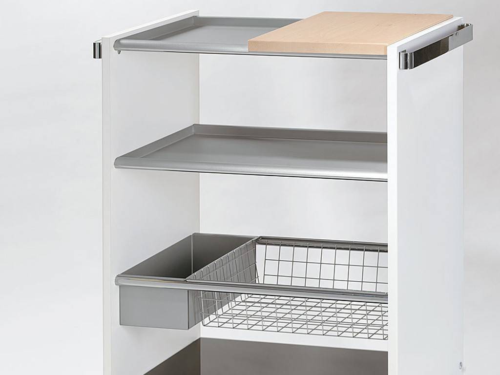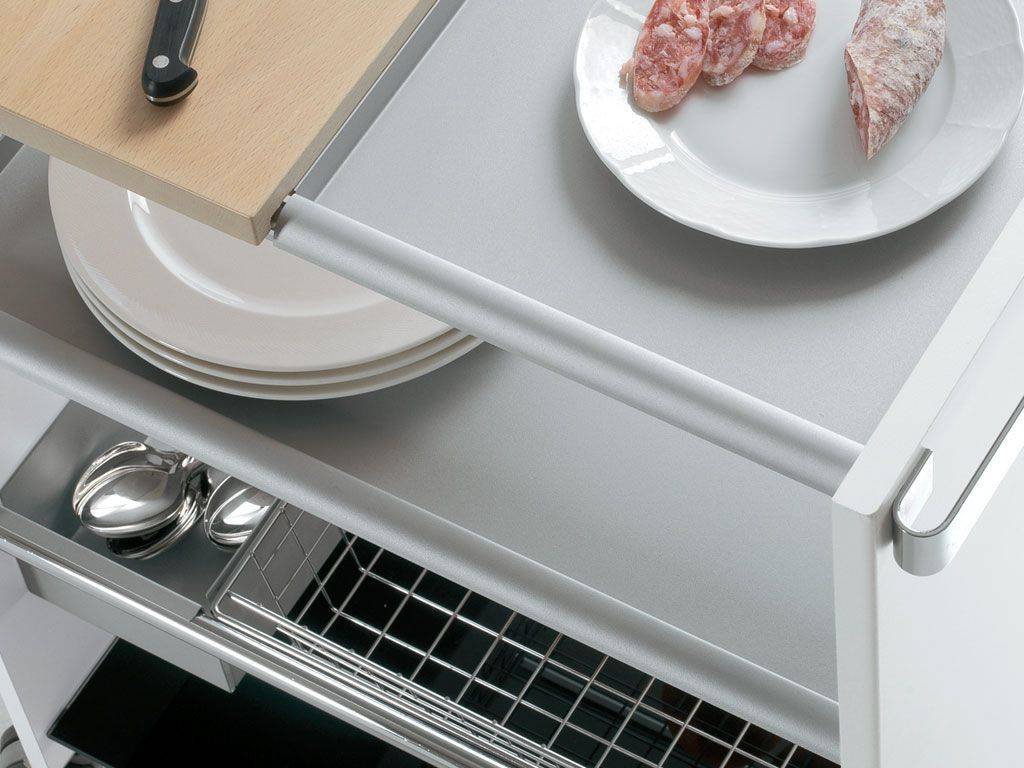Carrello multifunzione. Struttura in laminato 18 mm. combinato con acciaio e vetro temperato. E’ corredato di numerosi utili accessori asportabili e intercambiabili in acciaio: vassoio piccolo, vassoio grande, vaschetta, tagliere in massello di faggio e cestello in acciaio cromato.