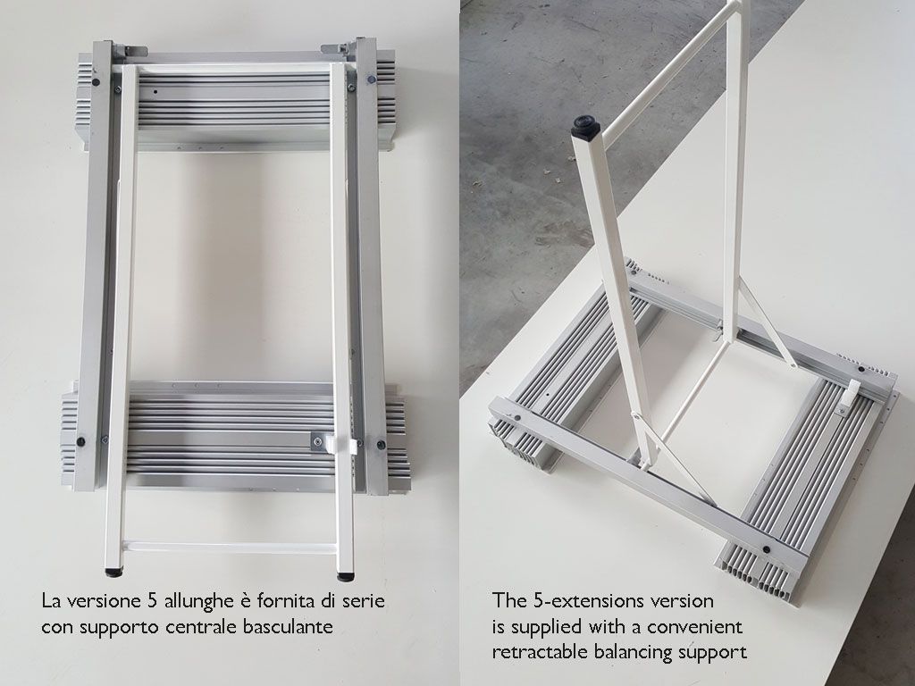 La versione con 5 allunghe è fornita di serie con comodo supporto centrale basculante a scomparsa per rendere più stabile il tavolo nella massima estensione.