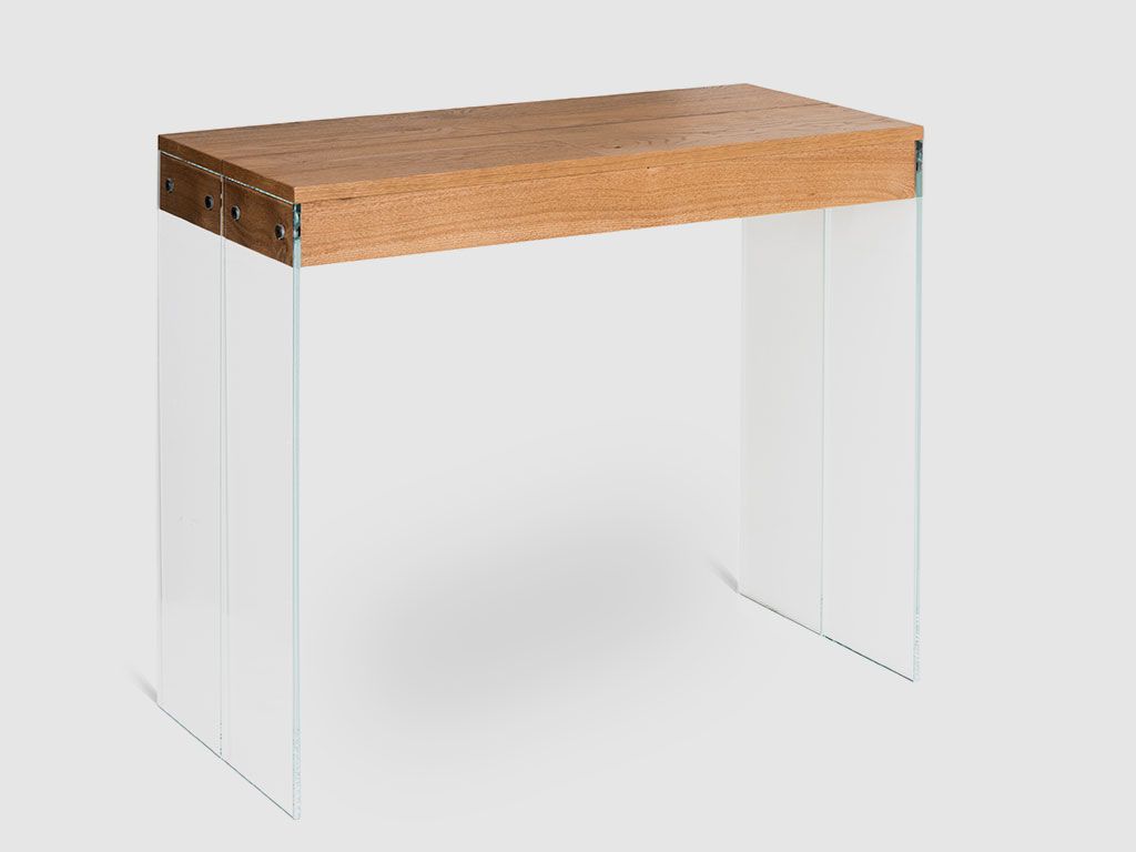Ausziehbares Konsole bis 3 Meter aus furniertem Eichenholz, mit 5 Verlängerungen je 52cm lang aus schwarzem Melamin, Tischbeine aus vorgespanntem extrahellem Verbundglas mm 10 + 10.Zentrales Bein aus Aluminium lackiert, um die Belastbarkeit des Tisches zu verbessern.