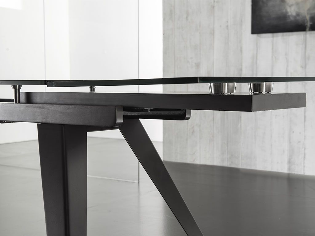 Track ausziehbarer Tisch mit Struktur aus lackiertem Metall und Platte aus durchsichtigem Glas.