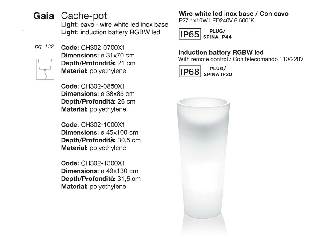 Stromversorgungssystem mit Batterie mit RGBW Led Kit: Arbeiten mit wiederaufladbaren Batterien und Fernbedienung. Die Aufladung erfolgt über eine Induktionsplatte. Das Kit hat den IP68 Grad und die Ladestation IP20. Leuchtdauer 10/12 Stunden mit ca. 5/6 Stunden Ladezeit. Das System ist in der Lage, Licht in den Farben Weiß, Gelb, Orange, Rot, Hellblau, Türkis, Blau, Pink, Fuchsia und Grün zu erzeugen. Darüber hinaus können mit der Fernbedienung fünf verschiedene Programme eingestellt werden: Festes Licht, Random Licht, Blitzlicht, Stroboskop Licht und Ausblendung, mit der zusätzlichen Möglichkeit, die Lichtintensität zu erhöhen oder zu verringern.
