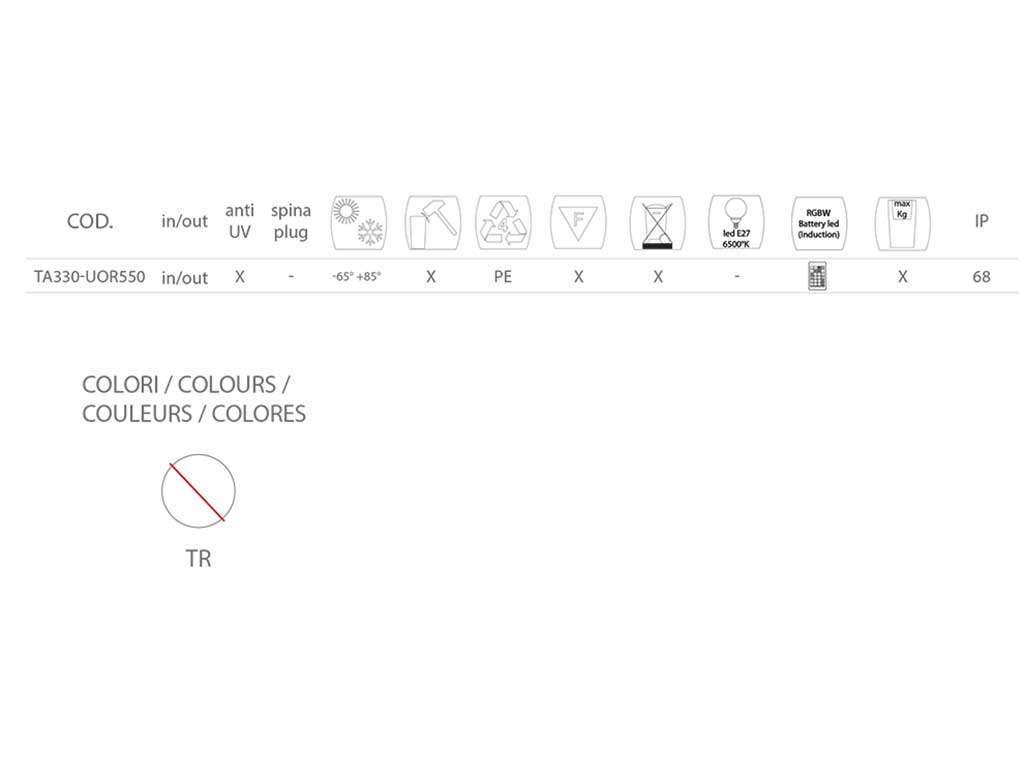 Stromversorgungssystem mit Batterie mit RGBW Led Kit: Arbeiten mit wiederaufladbaren Batterien und Fernbedienung. Die Aufladung erfolgt über eine Induktionsplatte. Das Kit hat den IP68 Grad und die Ladestation IP20. Leuchtdauer 10/12 Stunden mit ca. 5/6 Stunden Ladezeit. Das System ist in der Lage, Licht in den Farben Weiß, Gelb, Orange, Rot, Hellblau, Türkis, Blau, Pink, Fuchsia und Grün zu erzeugen. Darüber hinaus können mit der Fernbedienung fünf verschiedene Programme eingestellt werden: Festes Licht, Random Licht, Blitzlicht, Stroboskop Licht und Ausblendung, mit der zusätzlichen Möglichkeit, die Lichtintensität zu erhöhen oder zu verringern.