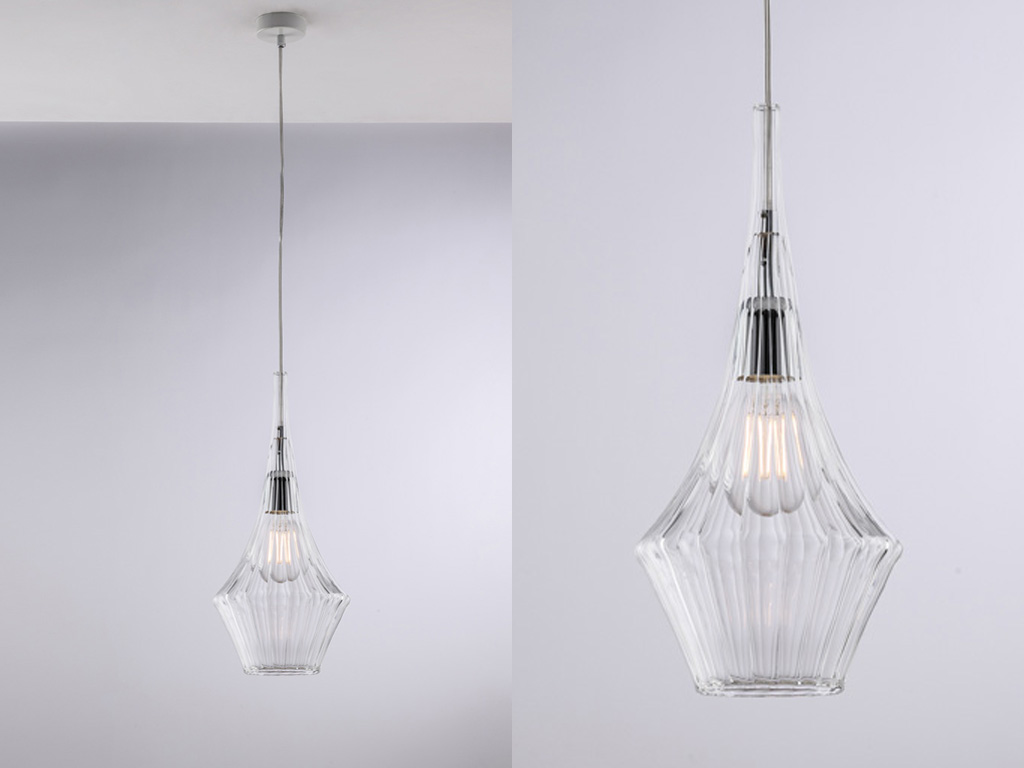 Gefertigt aus mundgeblasenem Glas, zeichnet sich die Leuchte durch ihre harmonische Silhouette und die feinen vertikalen Verarbeitungen aus, die das Spiel von Licht und Schatten verstärken. Der diffuserförmige, skulpturale Lampenschirm bringt Bewegung und Leichtigkeit in den Raum und fügt sich sowohl in moderne als auch in klassischere Interieurs perfekt ein.