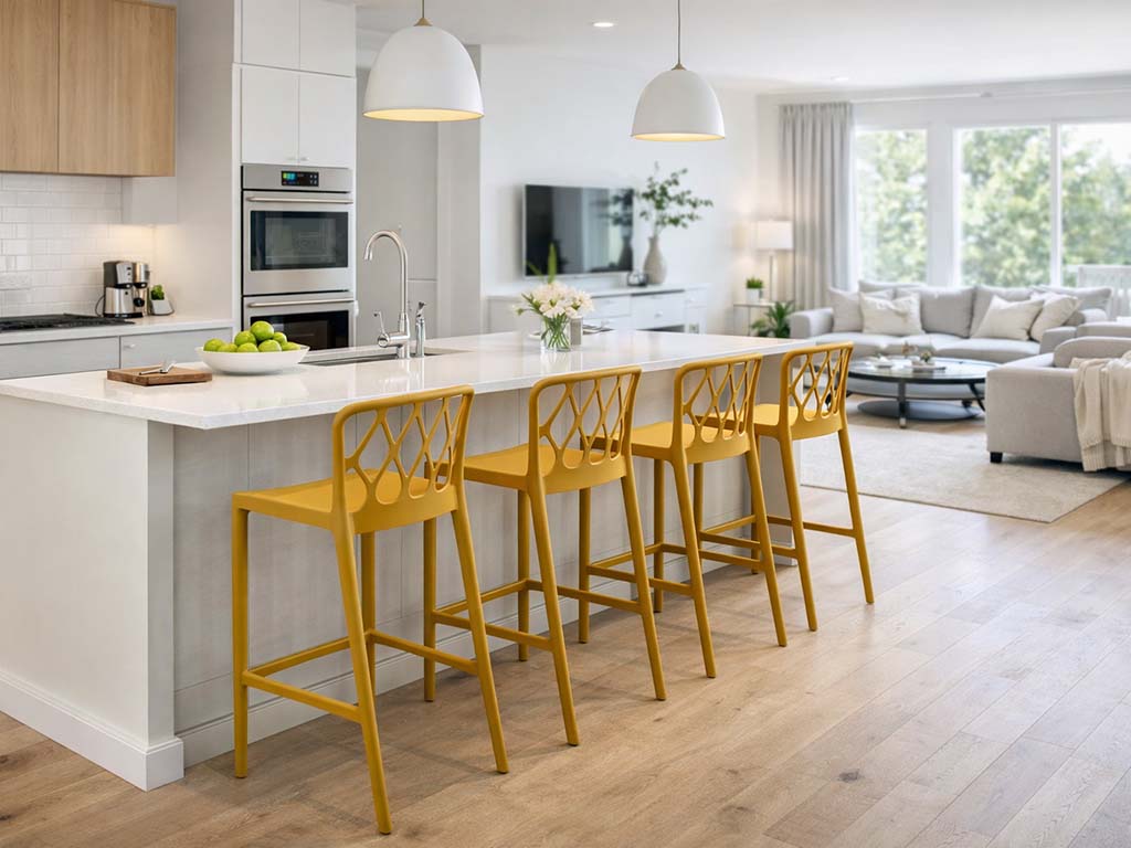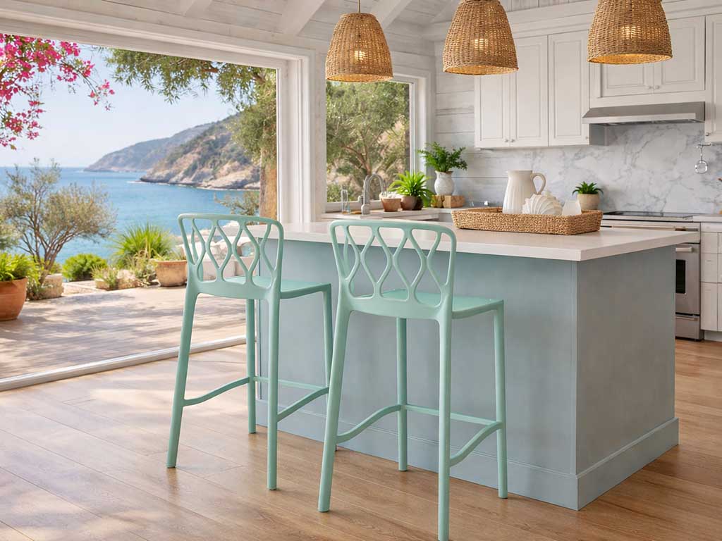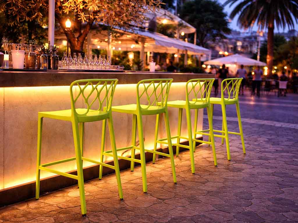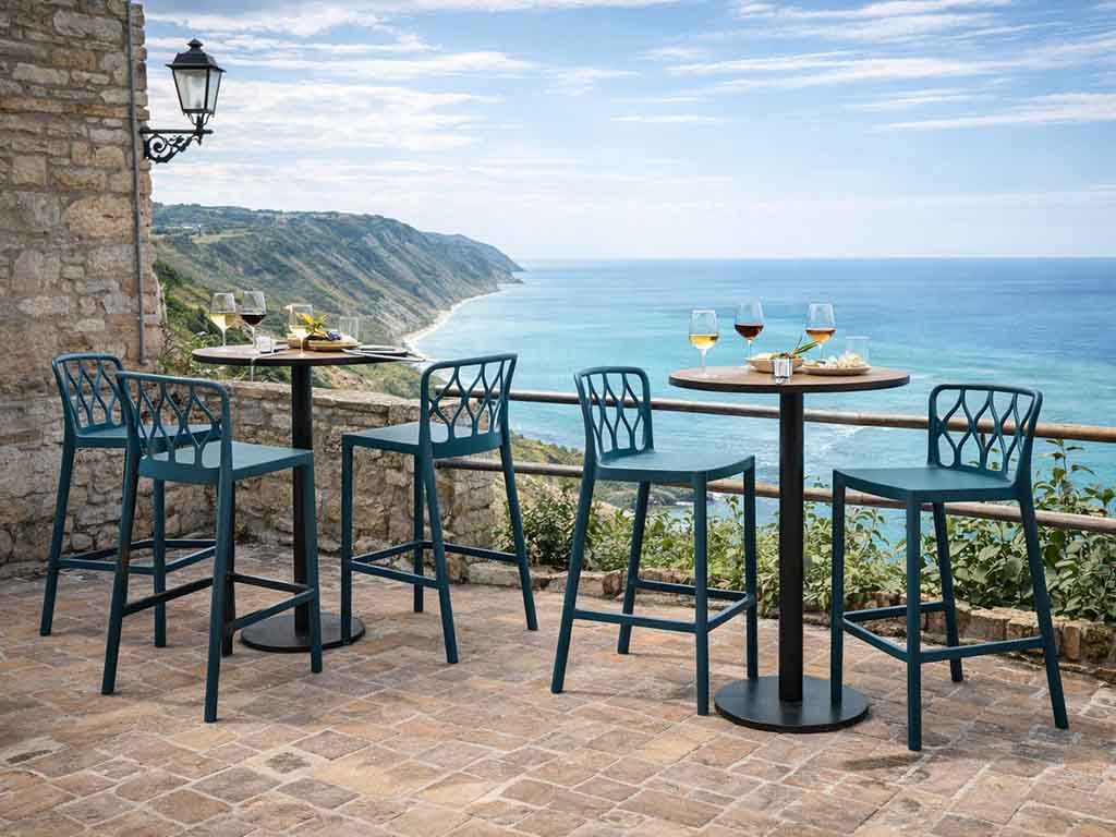 Robuste und stapelbare Barhocker für Innen- und Außenbereiche