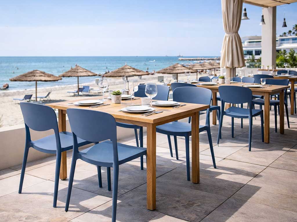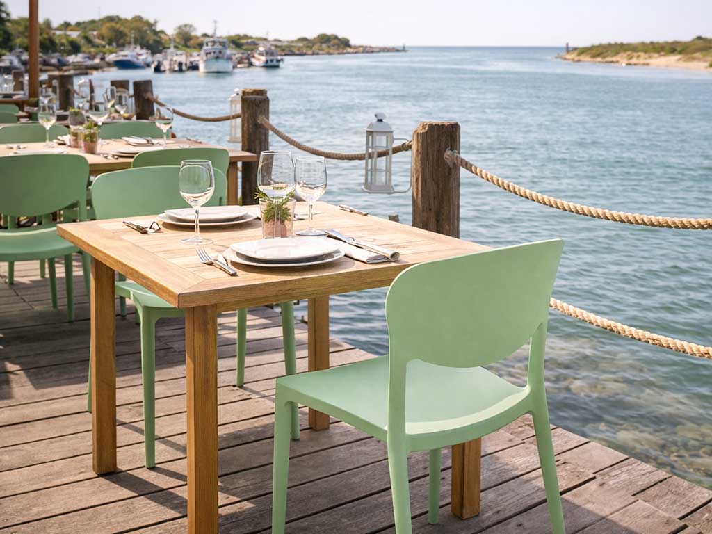 Dank ihrer stabilen Konstruktion und des ergonomischen Designs sind diese Sitzmöbel besonders geeignet als Restaurantstühle und Barstühle. Ideal für Innenräume, Terrassen mit Meerblick, Landbistros oder urbane Locations – sie lassen sich hervorragend mit modernen Tischen aus Holz oder Metall kombinieren und schaffen einladende Räume mit starker visueller Wirkung.