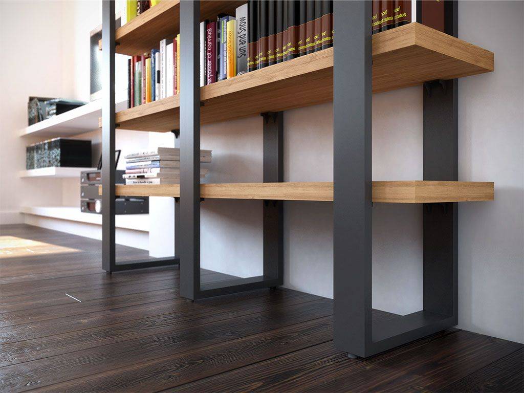 Moderne Anbaubücherregale mit Pfeiler aus Metall und Holzregale.