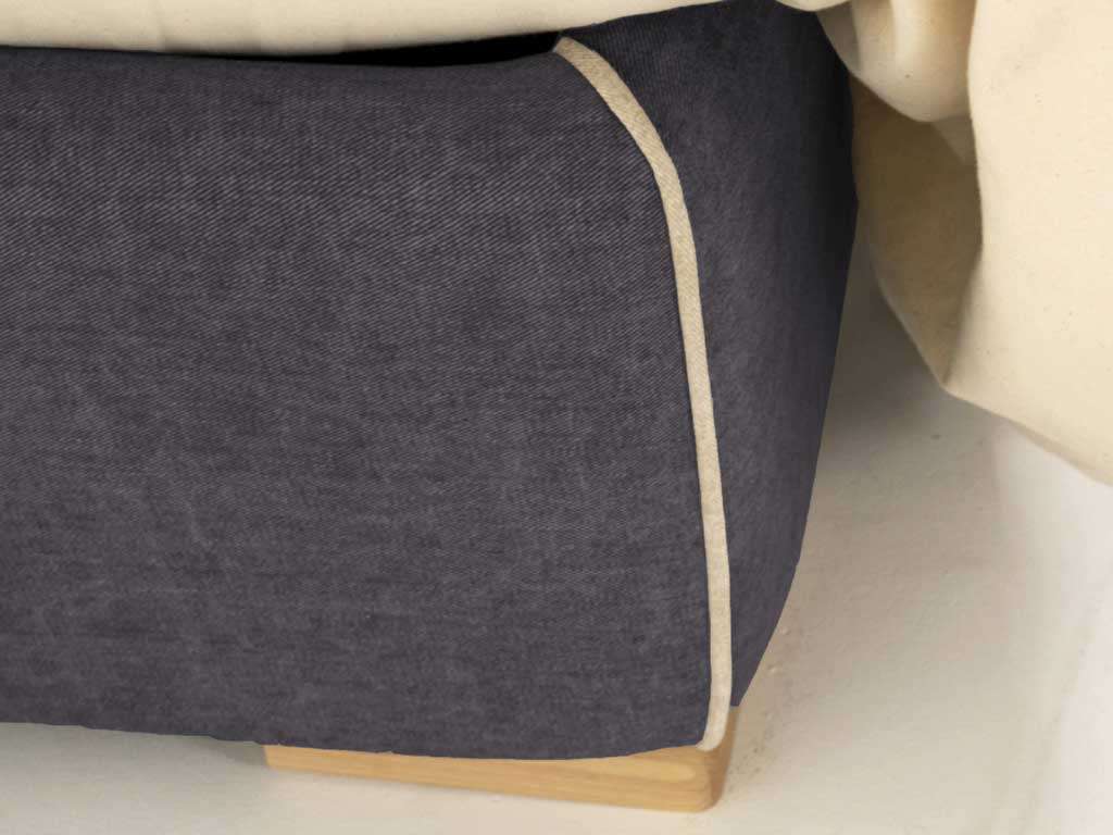 Doppelbett Polster, modernes Polsterbett mit nordischem Design, bezogen mit Stoff mit Jeanseffekt, mit Holzfuß und Bettrahmen mit beiger Umrandung....