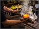 Das Glas, das vom Glasmeister in den Gestell aus Edelstahl geblasen wird, bläst sich auf und nimmt die gewünschte Form an.