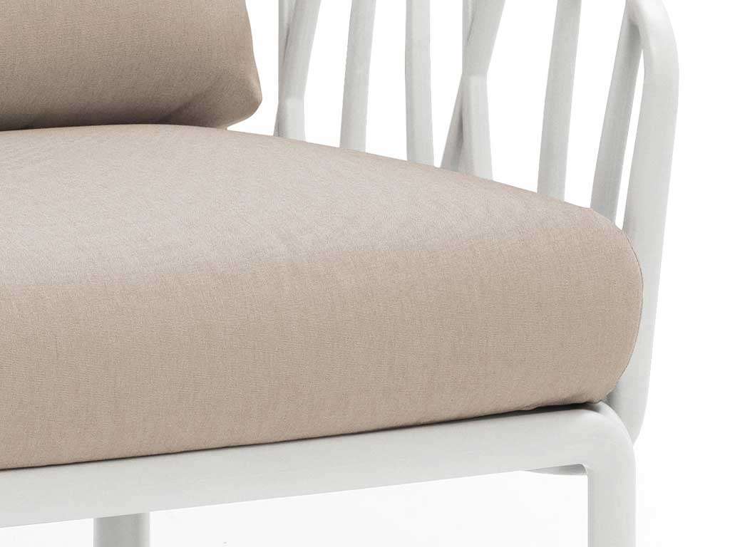 Modulares gepolstertes Sitzsystem, modular und beliebig konfigurierbar. Die Struktur, inspiriert von den Zweige der Bäume, charakterisiert die Möbel und nimmt weiche und farbenfrohe Kissen auf, um Ihren eigenen Raum unter freiem Himmel zu schaffen.