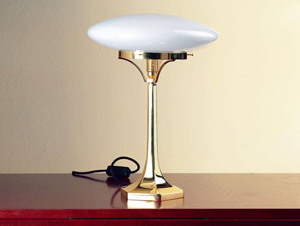 Tischlampe. Basis aus geschmolzenem Messing. Glashalter aus satiniertem und gelotetem Messing. Diffusor aus Glas, der auf Form aus Holz blasen wird, milchig–Weiß.