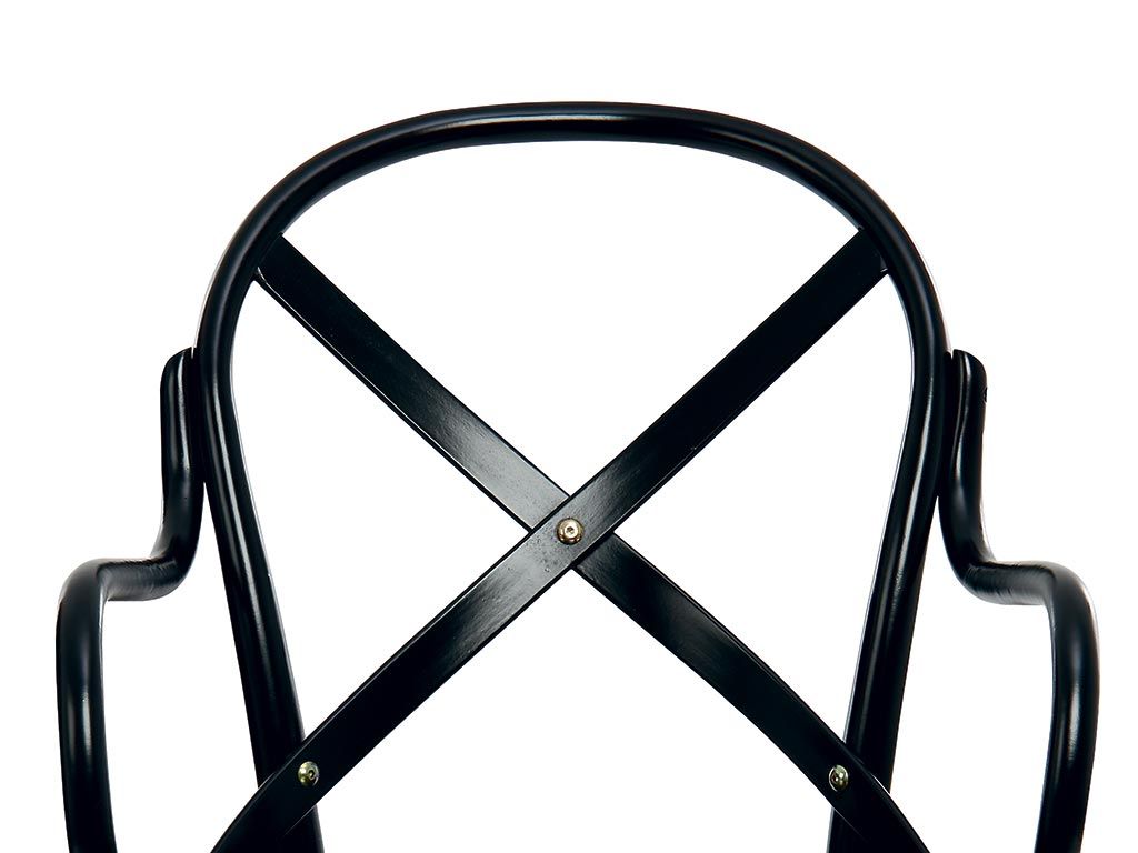 Holzstuhl mit Armlehnen, Vintage-Design-Stuhl, zeichnet sich durch weiche Linien und die komfortabele Rückenlehne mit gekreuzten Bändern aus, der Stil erinnert an den von Thonet-Stühlen aus gebogenem Holz, aber in einer moderneren Version....