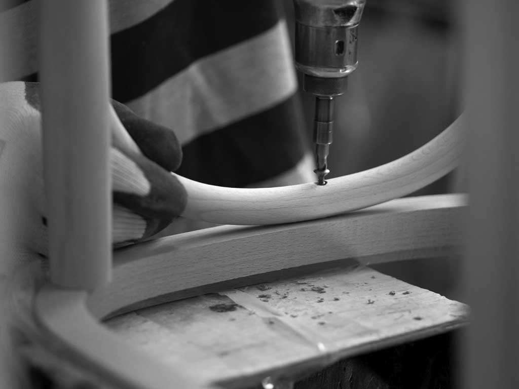 Holzstuhl mit Armlehnen, Vintage-Design-Stuhl, zeichnet sich durch weiche Linien und die komfortabele Rückenlehne mit gekreuzten Bändern aus, der Stil erinnert an den von Thonet-Stühlen aus gebogenem Holz, aber in einer moderneren Version. Erhältlich in verschiedenen Holzdekoren.