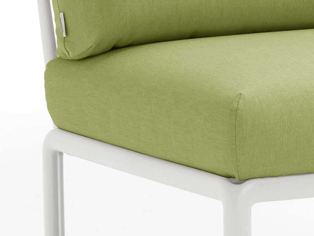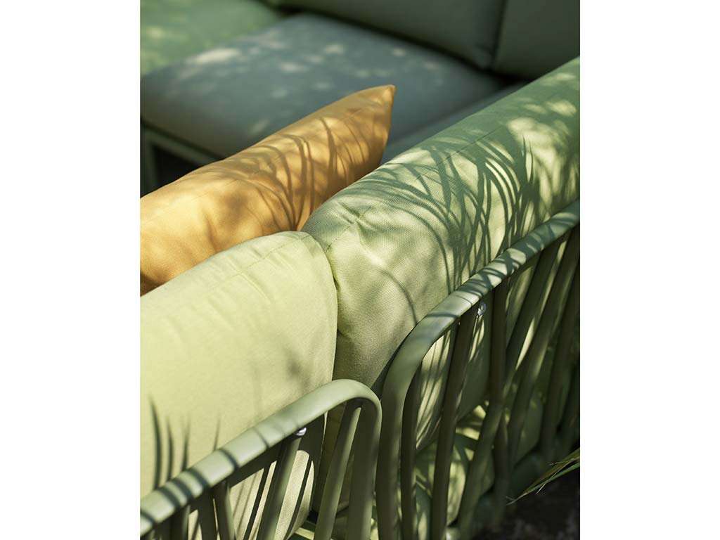 Modulares gepolstertes Sitzsystem, modular und beliebig konfigurierbar. Die Struktur, inspiriert von den Zweige der Bäume, charakterisiert die Möbel und nimmt weiche und farbenfrohe Kissen auf, um Ihren eigenen Raum unter freiem Himmel zu schaffen.