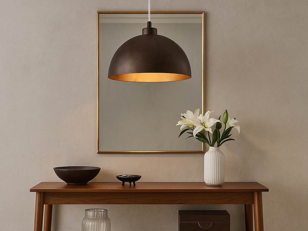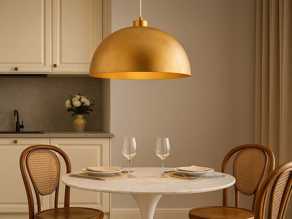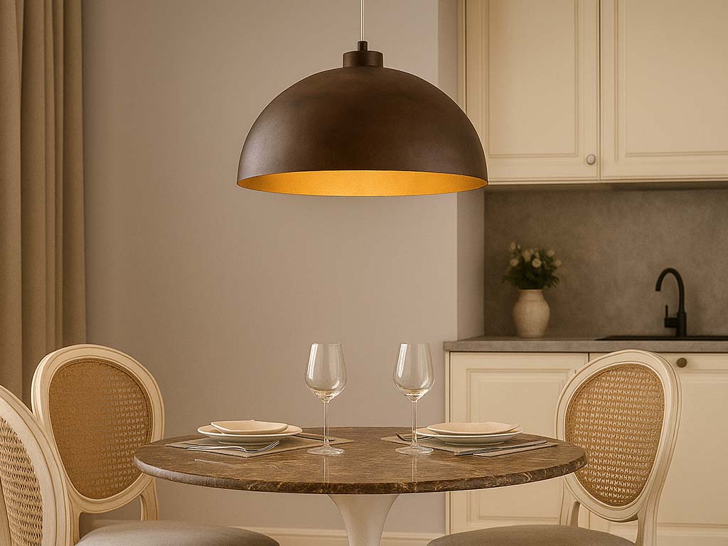 Die kuppelförmige Metall-Pendelleuchte ist ein Designobjekt, das jedem Raum Charakter und Wärme verleiht. Durch ihre halbkugelförmige Form verteilt sie das Licht gleichmäßig und schafft eine gemütliche, raffinierte Atmosphäre. Ideal über einem Esstisch, einer Kücheninsel oder im Wohnzimmer – sie fügt sich harmonisch in moderne, elegante Umgebungen ebenso wie in shabby-chic oder industrielle Einrichtungen ein.
