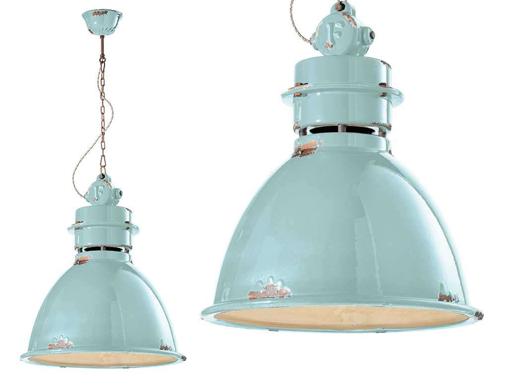 Industrielle Lampe, vintage Hängelampe, Lampe für Küche, perfekt als vintage Hangelampe oder vintage Deckenlampe. Lanterne in Retro-Stil, bestanden aus Keramik mit vintage Farben, ist von den Laternen der Handelsschiffe inspiriert. Der altertümliche Stil entsteht aus Verschleiß-Effekten, die absichtlich durch handwerkliche Techniken realisiert werden, und die um deren kleinsten Details gekümmert werden. Metallteile aus antikem Eisen Corten. Mehrfarbig beschichtetes Baumwollkabel. Kette aus antikem Eisen Corten.