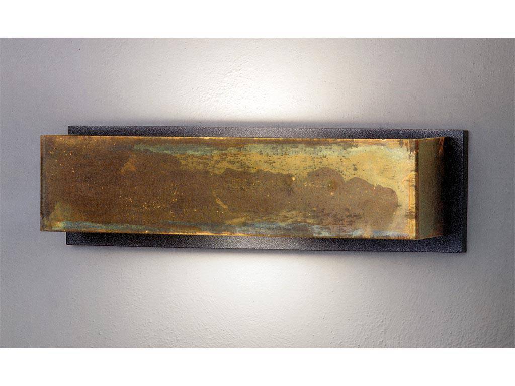 Kollektion von Wandlampen aus oxydiertem Messing, mit Hintergrund aus pulverlackiertem Rundstahl. Lichtschirm aus vorgespanntem Glas, um das Licht direkt oder indirekt zu verbreiten.