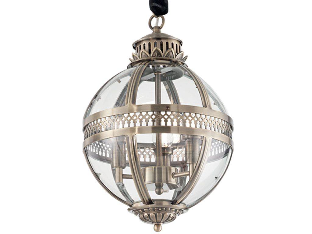 Gestell aus Metall. Lichtverteiler aus geblasenem Transparent glas.Kettenbezug aus Samt.Drei Leuchtmittel im Inneren der Metall-Käfig.