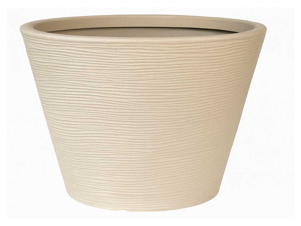 Seine moderne, nach oben geöffnete Form wird durch eine gerillte Oberfläche im Shabby-Stil ergänzt, die ihm eine natürliche und elegante Optik verleiht und Pflanzen, Blumen oder kleine Zierbäume besonders schön zur Geltung bringt.