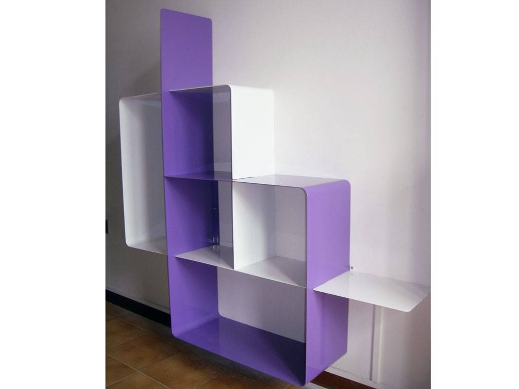 Modernes Einbaubücherregal, es besteht aus 2 zusammengesteckten Elementen, (verschiedene Weite cm. 25 un cm. 22) und einem bunten Hintergrund in der Mitte.