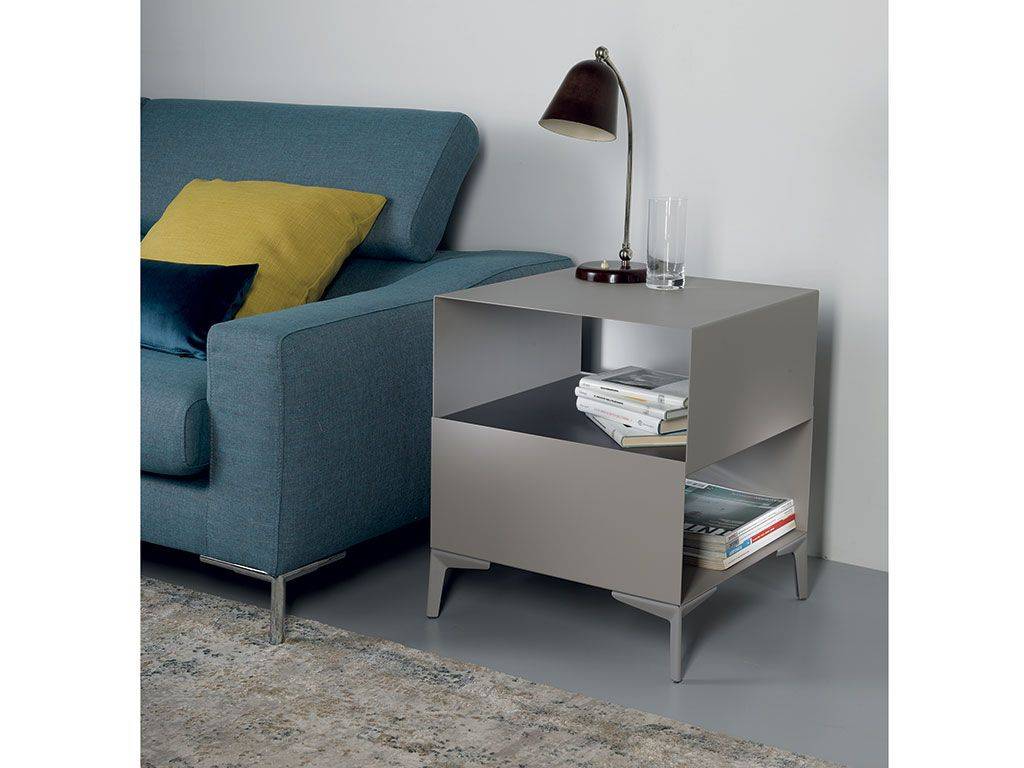 Quadratischer Couchtisch, viereckiger Wohnzimmertisch, Metalltischchen, Tischchen 50x50, ideal als Sofa-Beistelltisch. Quadratische Zeitungsständer Tischschen, aus sablè-beschichtet Stahl. Zentrales Regal eingebettet in die Struktur aus ökologischem Laminat In allen Farbtönen erhältlich.