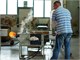 Das vom Glasbläsermeister in den Edelstahlrahmen geblasene Glas quillt in die gewünschte Form.