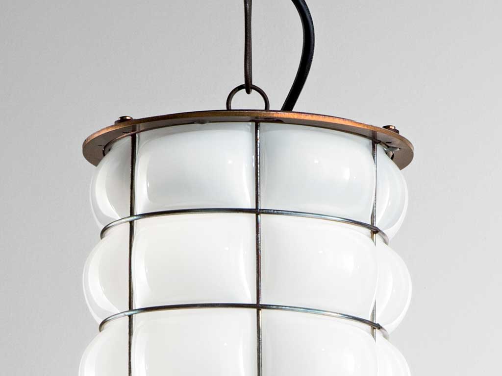 Lampe aus mundgeblasenem Glas in einem Edelstahlkäfig, hergestellt von venezianischen Handwerksmeistern, zeitlose Modelle in einer perfekten Kombination aus Eleganz und Raffinesse.
