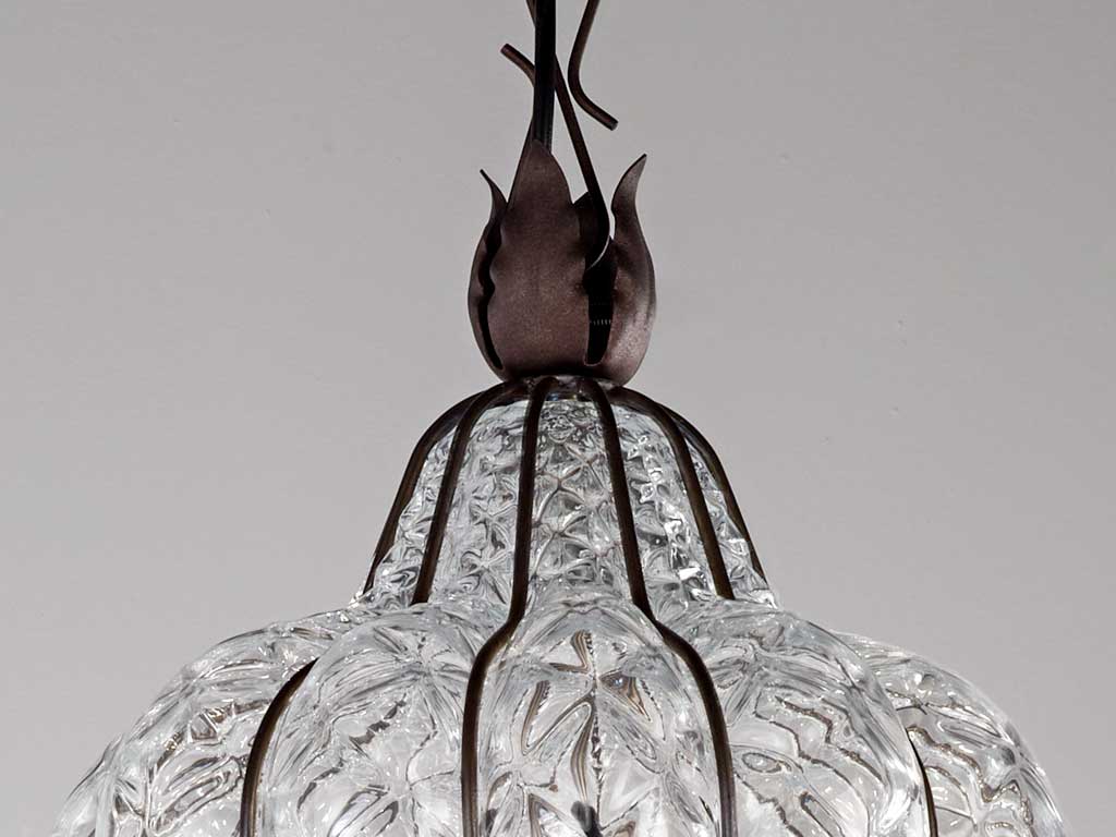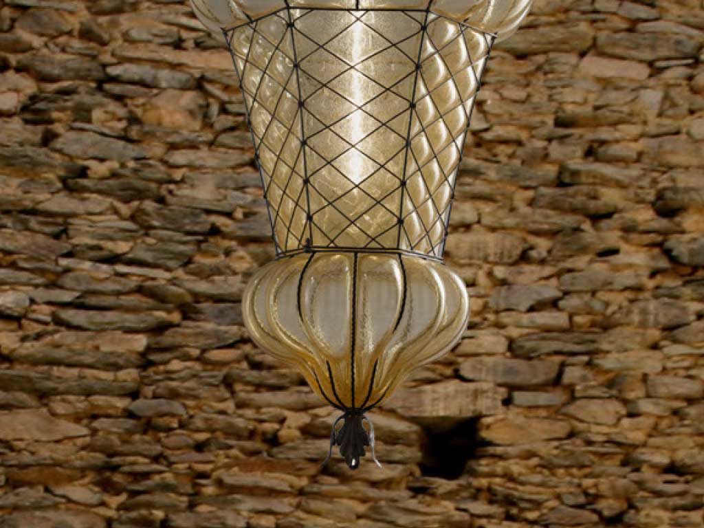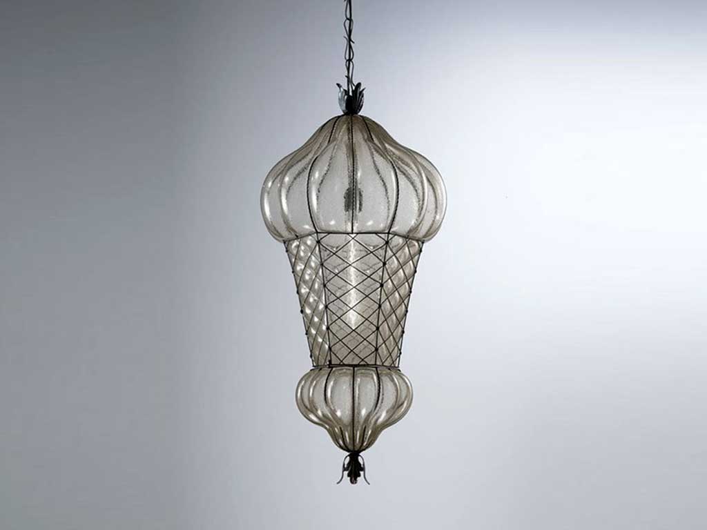 Eine Lampe aus mundgeblasenem Glas in einem Käfig aus rostfreiem Stahl, von venezianischen Meisterhandwerkern gefertigt , zeitlose Modelle in einer perfekten Kombination aus Eleganz und Raffinesse.