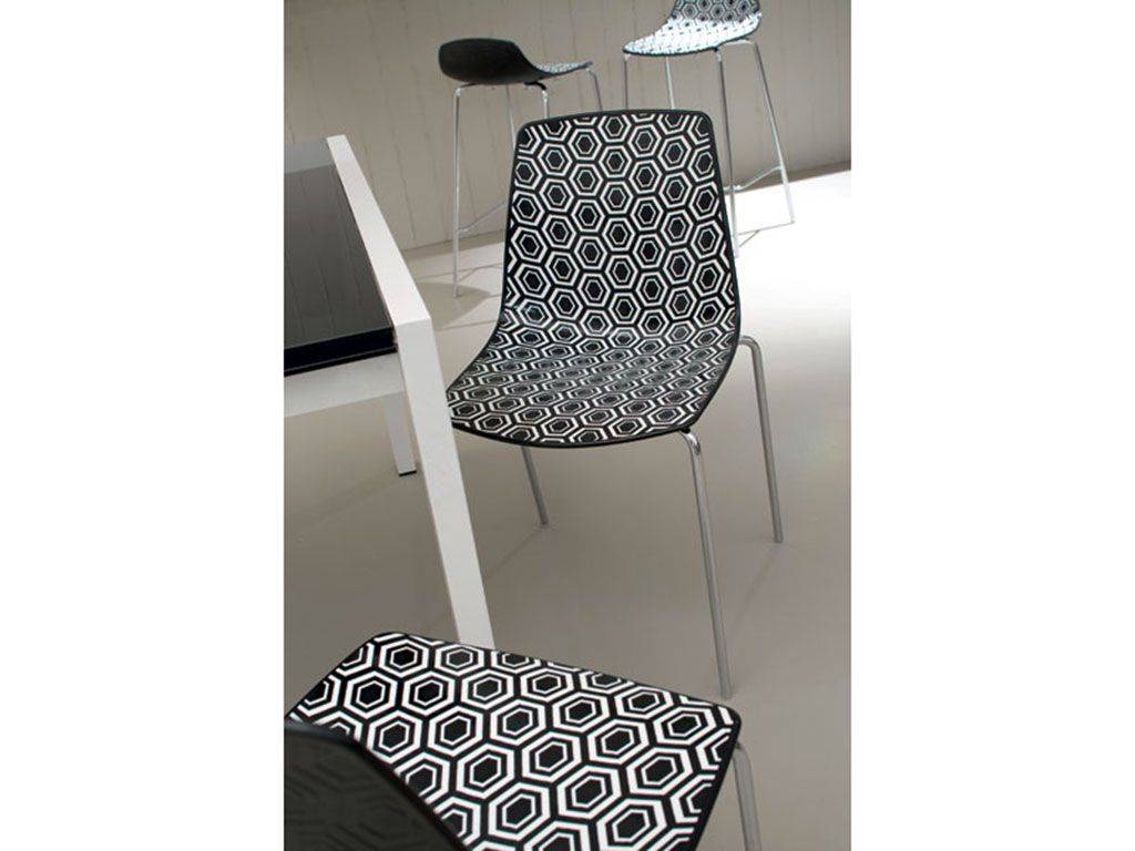 Stuhl mit Struktur aus verchromtem Metall und Sitz mit hexagonaler Zeichnung.Verfügbare Farben: weiß-graue Rauten, weiß-rote Rauten, weiß-violett Rauten, weiß-taubengraue Rauten, weiß-grüne Rauten, braun-haselnussbraune Rauten, schwarz-taubengraue Rauten, schwarz-weiße Rauten.