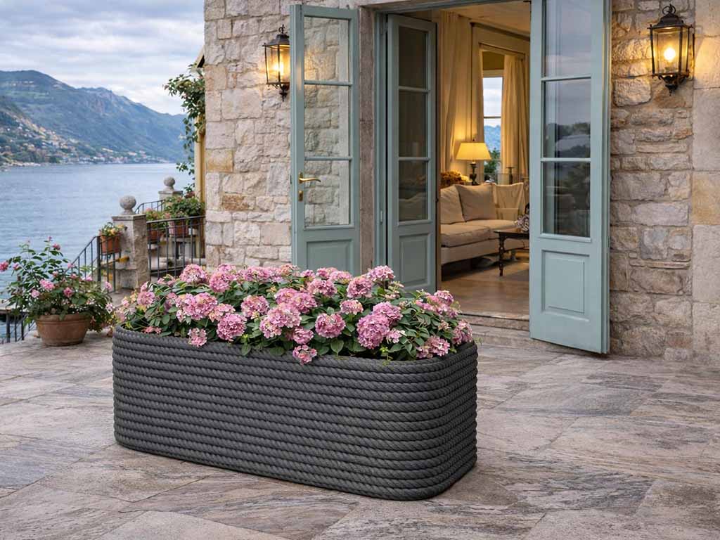 Der Bali Cassetta Blumentopf mit Seiloptik vereint modernes Design, Funktionalität und Haltbarkeit.