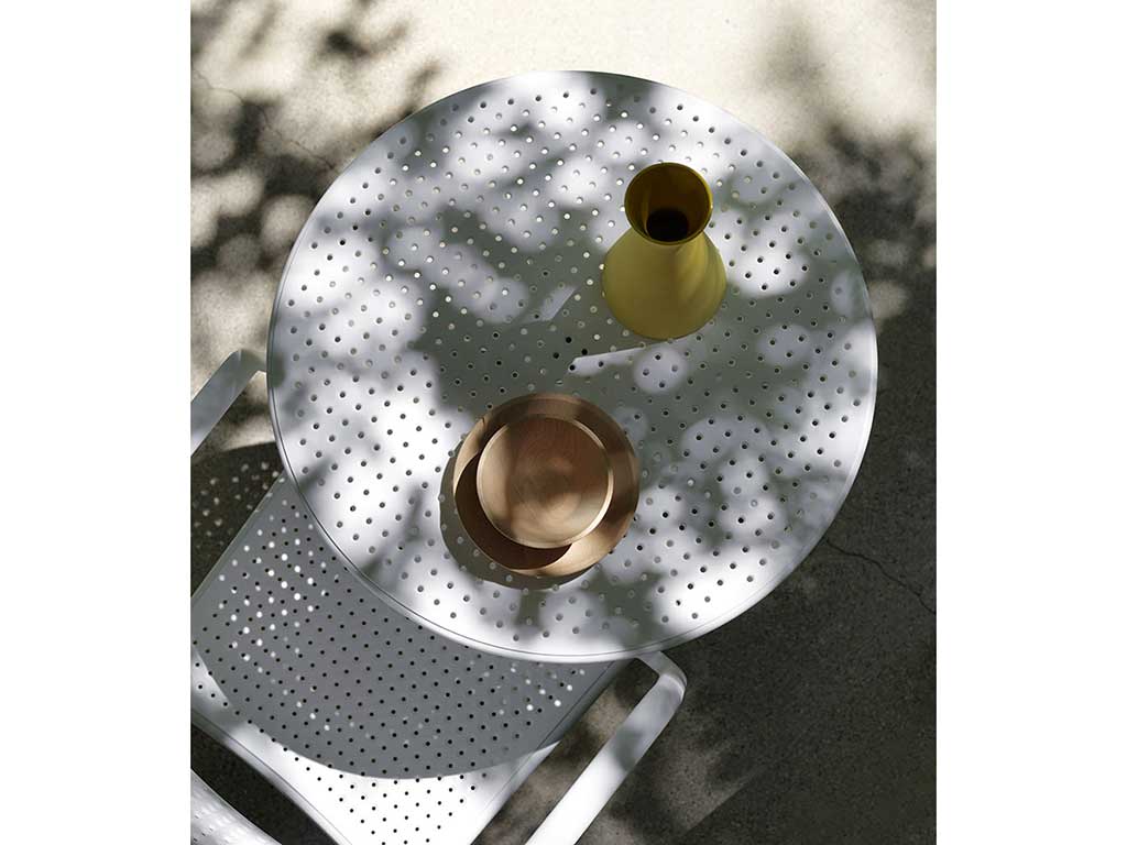 Couchtisch aus Glasfaserharz mit runder Platte und kleinen dekorativen und funktionellen Löchern, die für einen guten Wasserablauf sorgen.