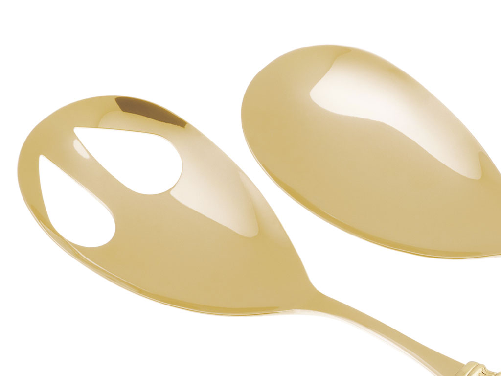 Das Arianna Oro Salatbesteck besteht aus einem gezahnten und einem glatten Servierlöffel.