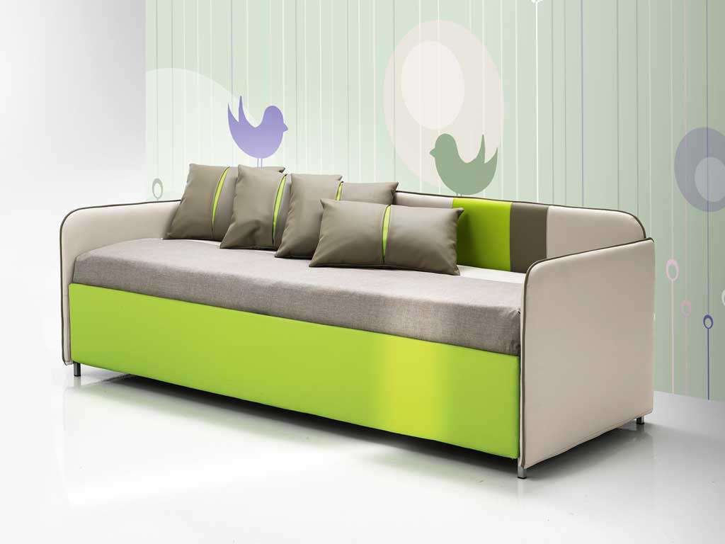 Schlafsofa mit einem linearen Design, wird es mit einem seitlich zu öffnenden Behälter angeboten, nützlich, um Dinge zu platzieren.