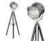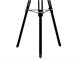 Flutlicht Lampe mit Dreifuß aus Holz schwarz matt lackiert. Details und Lichtkörper aus Metall Chrom. Lichtverteiler aus transparentem Glas mit inneren Klappen zur Einstellung des Lichtstrahls.