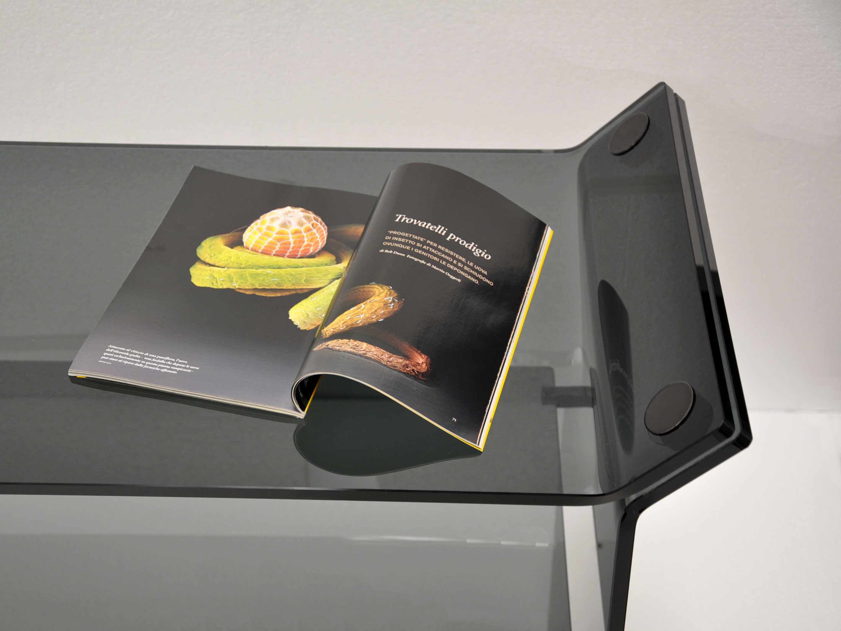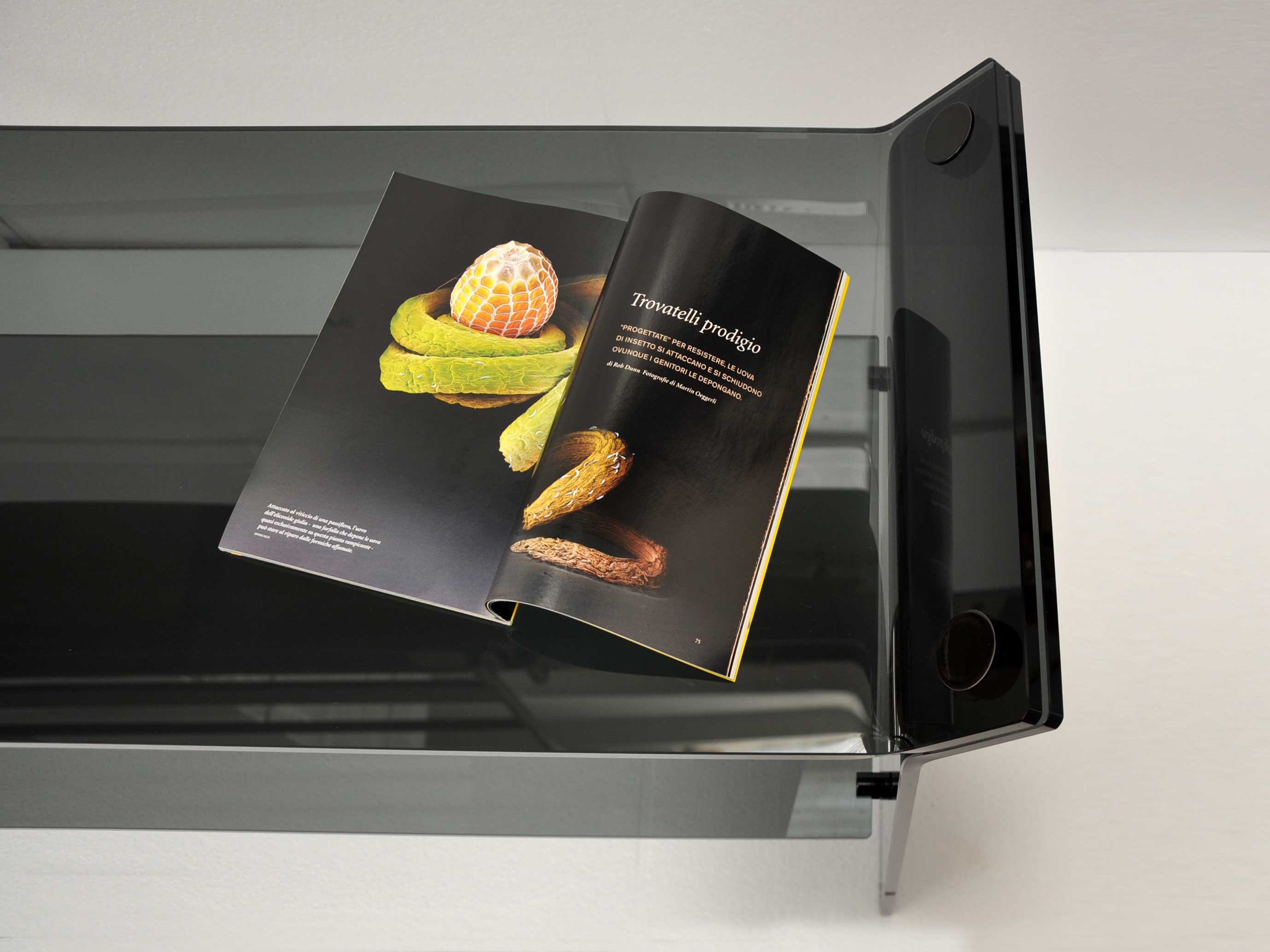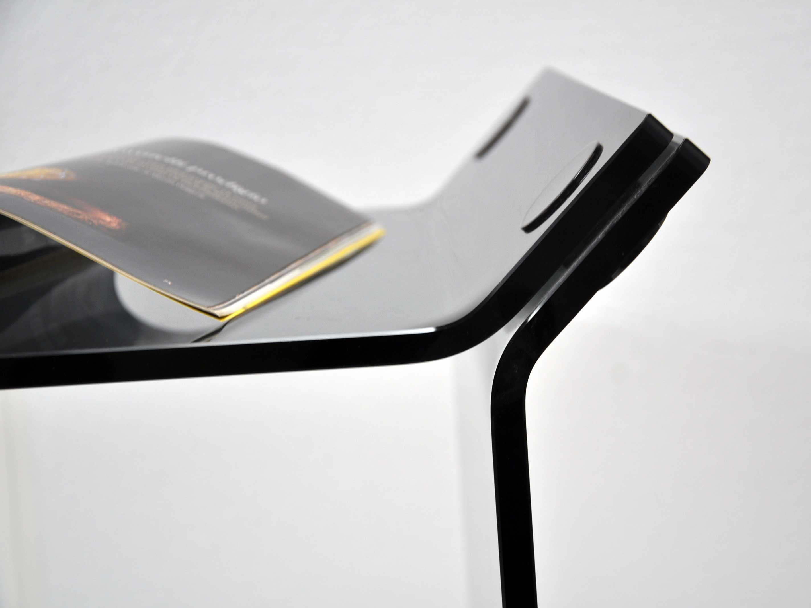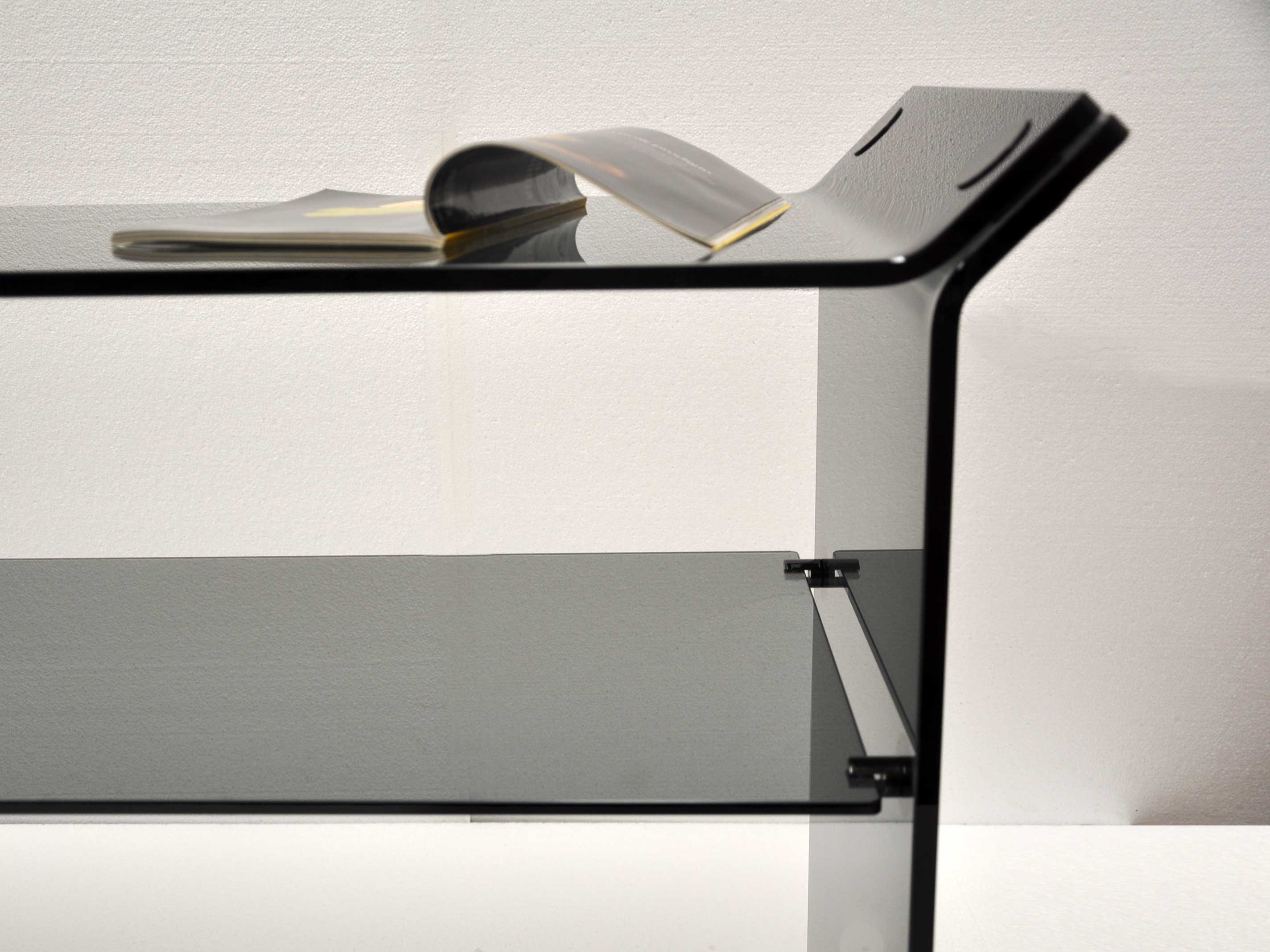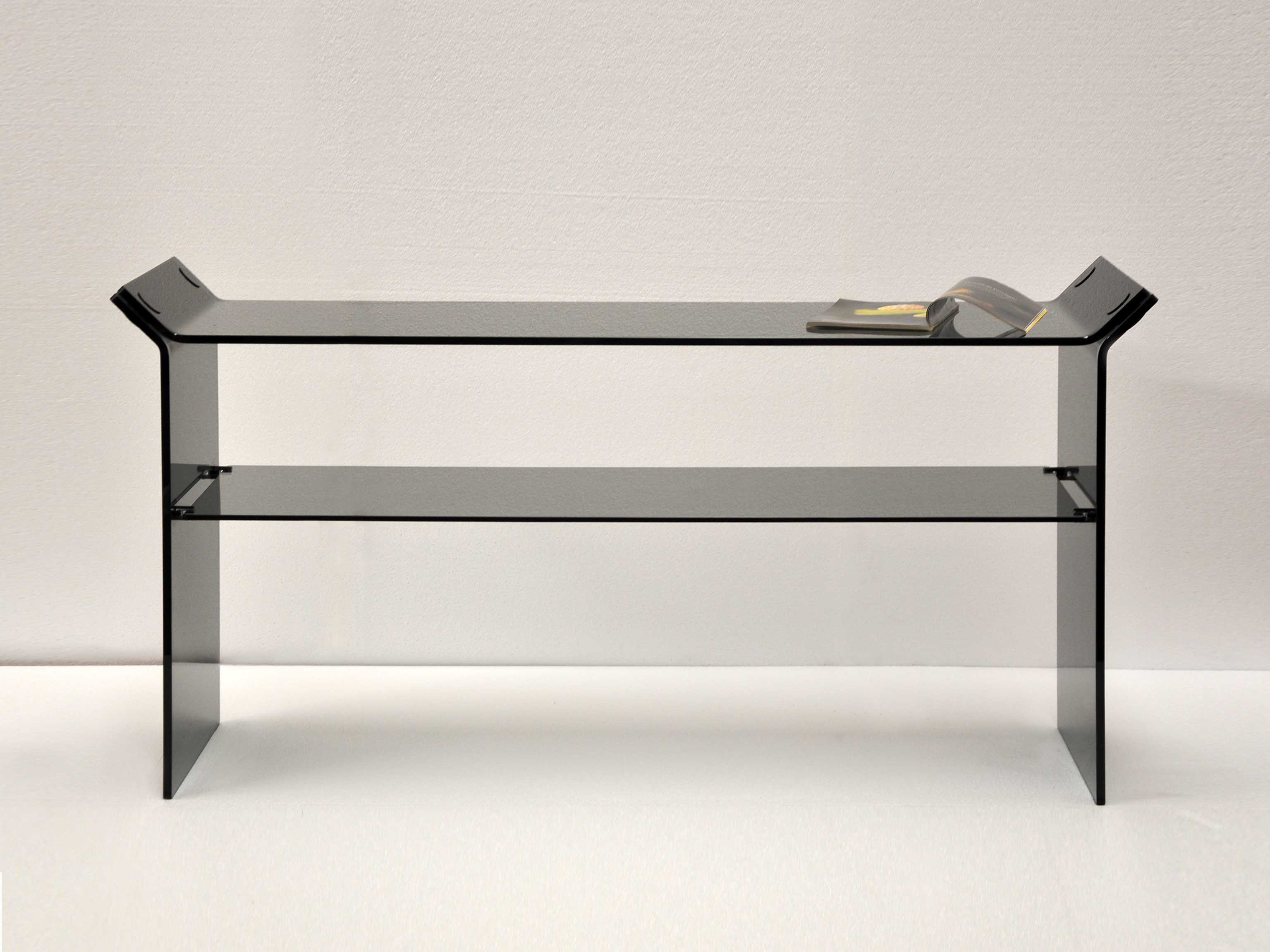 Konsole aus gebogenem Glas für Wohnzimmer oder Büro mit 2 Regalen und Platten aus Stahl.Farbe: durchsichtig rauchfarbig.