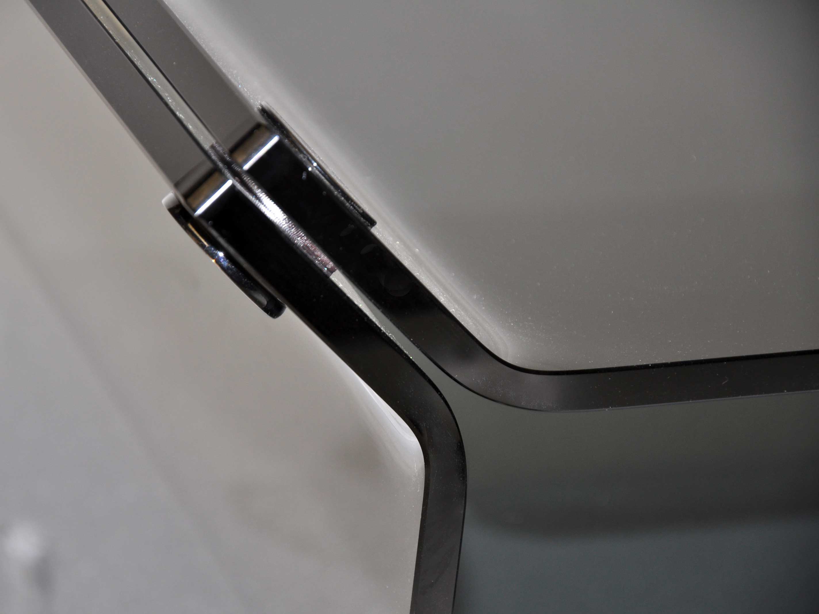 Tischchen aus gebogenem Kristall für Wohnzimmer oder Büro mit 2 Regalen und Platten aus Stahl. Farbe: durchsichtig rauchfarbig.
