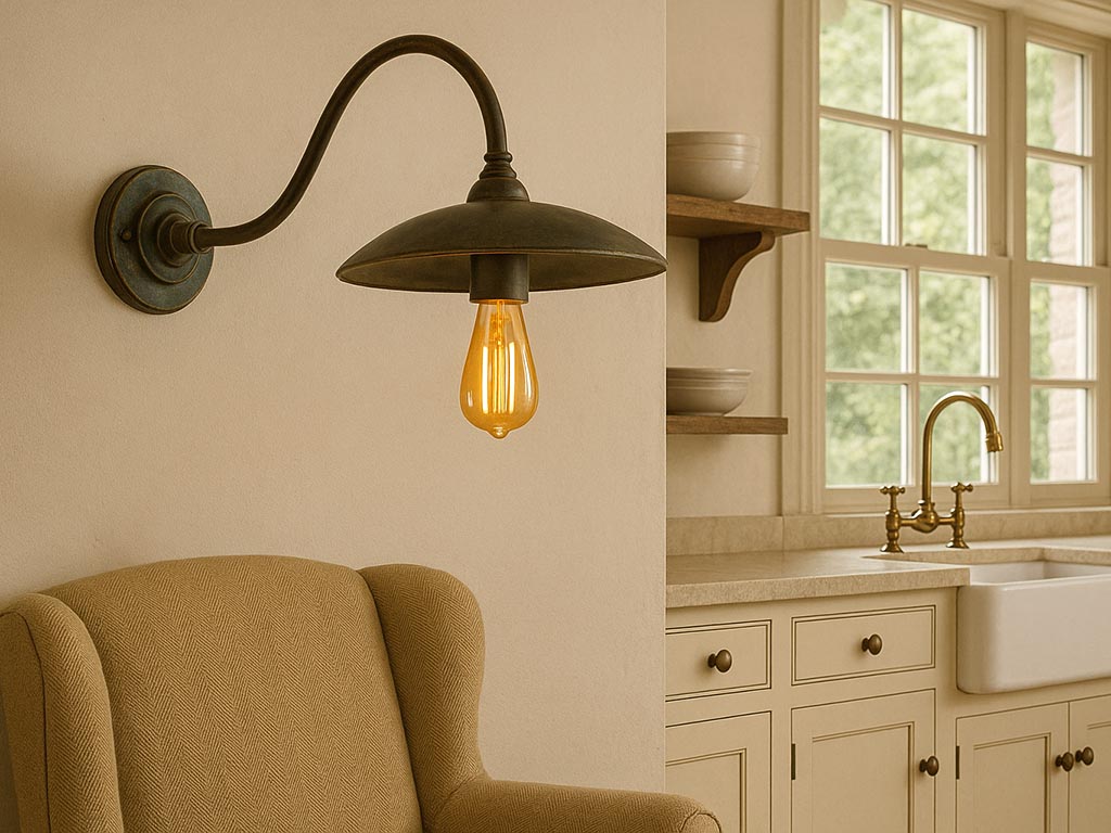 Wandlaterne, Wandleuchte aus Messing für Innenbereiche geeignet, aus Messing-Druckguss und Platte. Ideal um vintagen Räume, wie Bauernhäuser, zu beleuchten. Sie ist auch geeignet für Industrielle Einrichtung.
