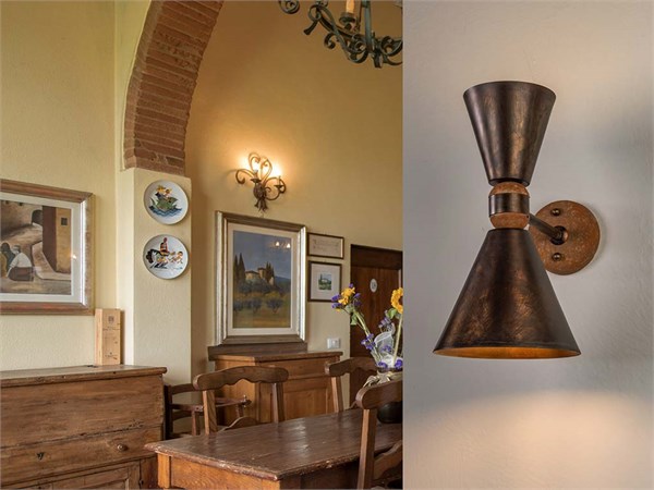 Wandleuchte Messing und Keramik, Wandlampe rustikal, Vintage Wandleuchte, sanduhrförmige Lampe mit Arm und Lampenfassung aus antikisiertem Messing, und mit Wandbefestigung und Befestigung der Lampenfassung aus verzierter Keramik. Lampe mit 2 Lampenfassungen, die eine indirekte Beleuchtung sowohl nach unten als auch nach oben ermöglichen. Perfekte Lampe, um rustikale oder klassische Räume zu beleuchten; vor allem im Wohnzimmer aber auch im Schlafzimmer über Nachttische. Ideale Lampe für Innenräumen, aber es ist möglich die Lampe auch in überdachte Außenräumen zu platzieren, solange sie vor Regen geschützt sind. Abmessungen: Lampenschirm 1 x Ø cm. 18 + 1 x Ø cm. 11,5 – Tiefe cm. 30 - Höhe cm. 32 Wandbefestigung Ø cm. 10 Lampe 2 x 60W E27 - IP20 (Glühbirne nicht mitgeliefert) Farbe: Arm und Lampenschirm aus aus antikisiertem Messing Wandbefestigung und Befestigung der Lampenfassung aus Keramik mit Verzierung Rot Ziegel Diese fein verarbeiteten und dekorierten Keramiklampen werden nach Regeln hergestellt, die auf die alte florentinische Handwerkskunst zurückgreifen, um jedes Mal ein Einzelstück zu bauen. Die Verzierungen streng handgefertigt werden, deshalb können sie geringfügige Abweichungen im Farbton im Vergleich zu den Bilder.