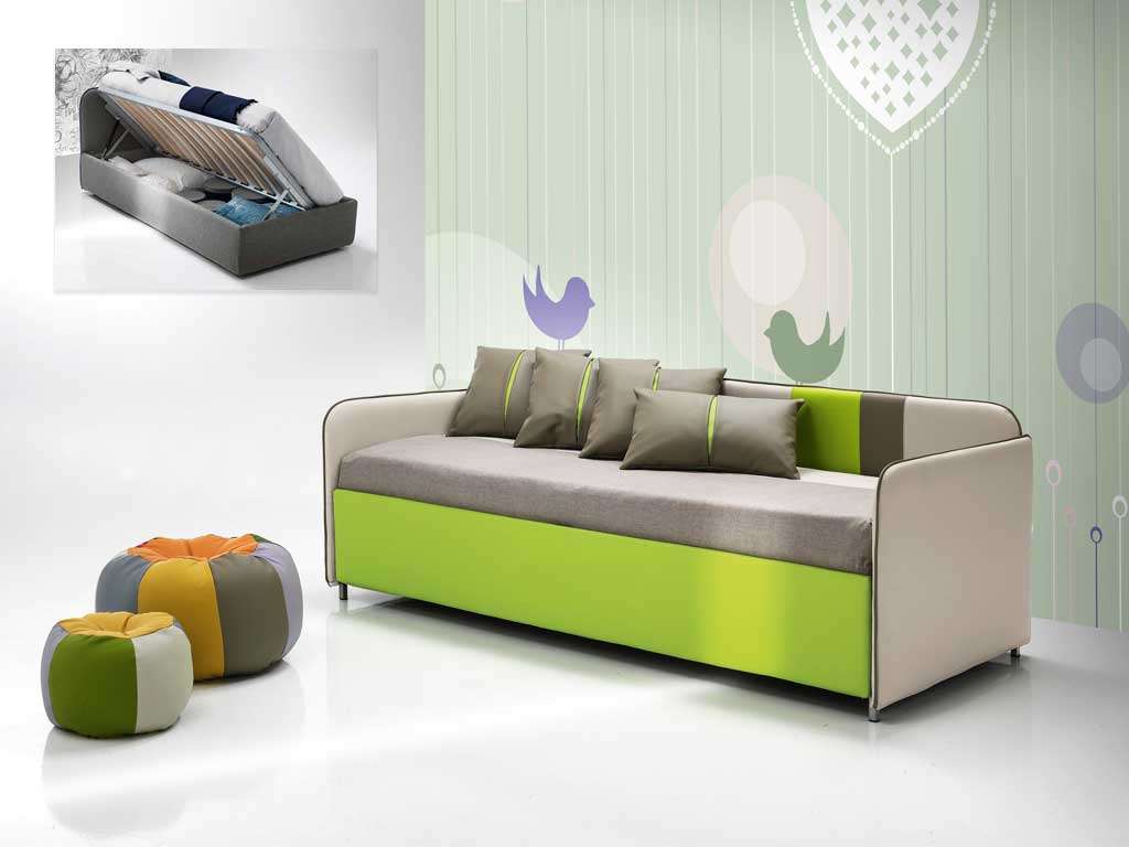 Divanetto letto singolo, letto a divanetto con contenitore apertura laterale, con rete ortopedica a doghe in faggio da 80x190 cm, rivestimento completamente sfoderabile disponibile in diversi colori.