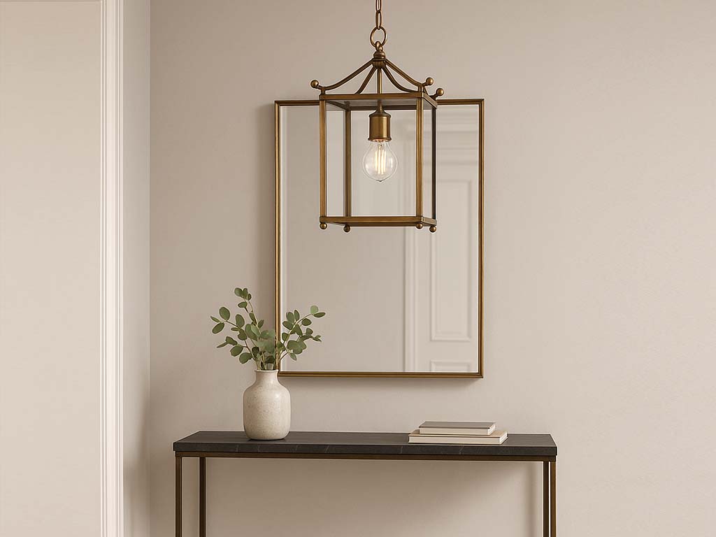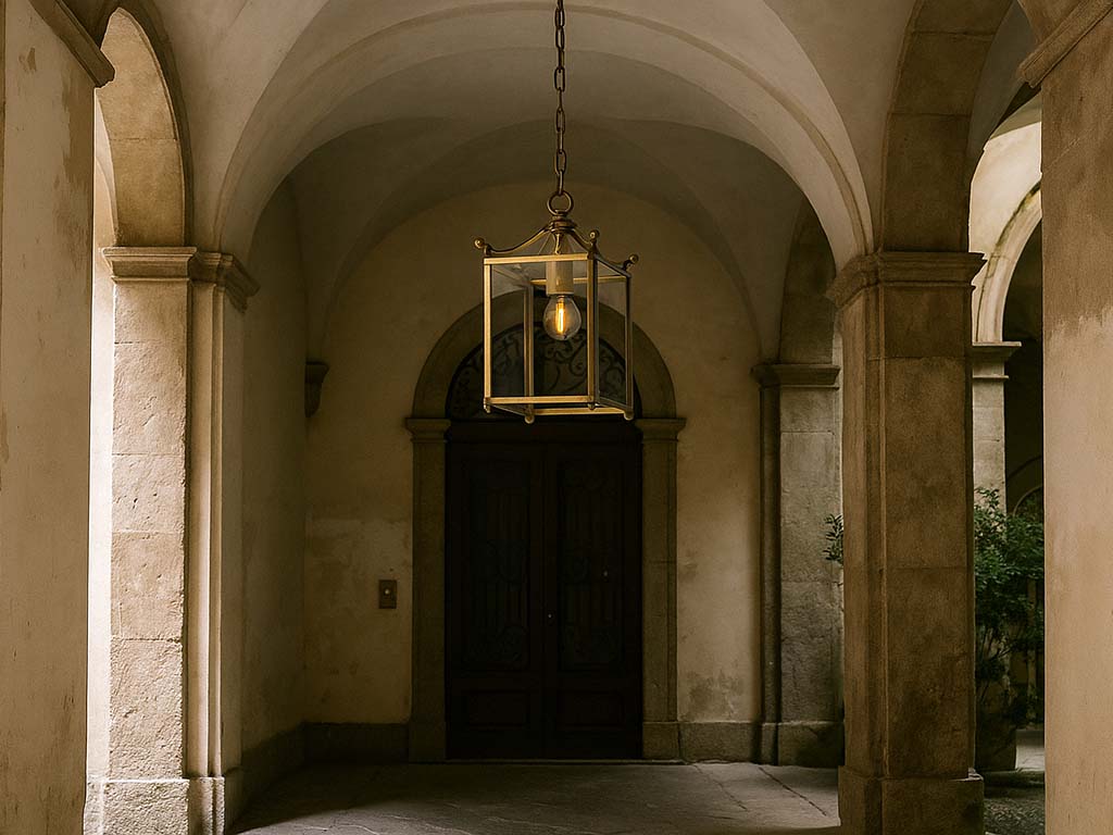 Antique brass lamp, hanging chandelier, transparent glass and frame in Brass or Bronze. Suitable for indoor and covered outdoor use, the Bronze version is the most suitable for outdoor use. Brass has a lighter finish with a brilliant shine, comparable to a gold appearance. The Bronze has a much darker finish and does not have much shine.