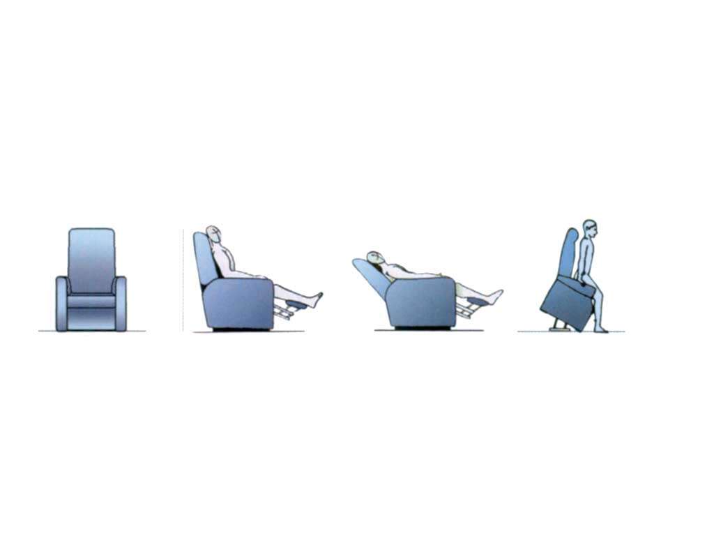 In the relaxing position the backrest is lowered to such an extent as to bring the body to a totally horizontal resting position ZERO GRAVITY 180 degrees, with a distribution of weight over the entire body and a total relaxation of the muscles.