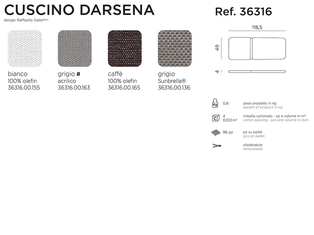 Olefin: Wash at 40°C. Very resistant to sun, stains, and mold.