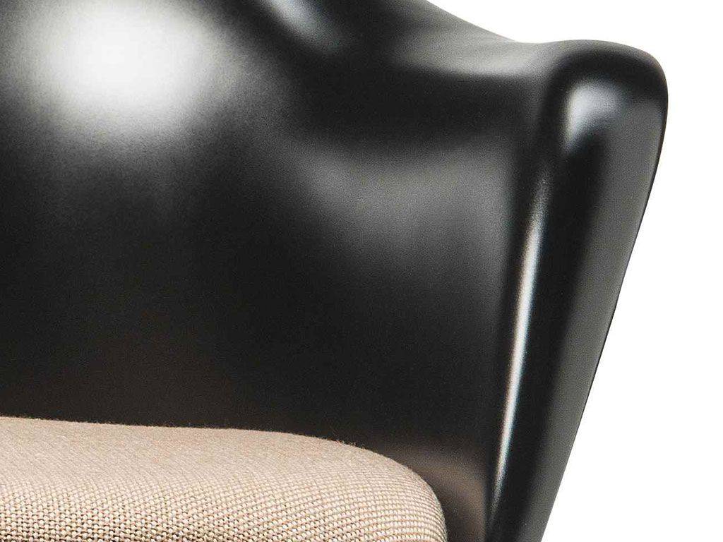 Armchair with arms and round base in fusion lacquered shiny aliminium and seat in fiberglass (matt), foam pillow in fabric coated. The pillow is assured to the chair by 4 velcro spots.