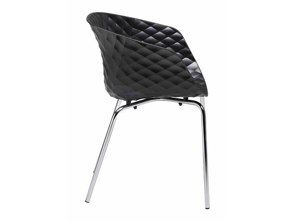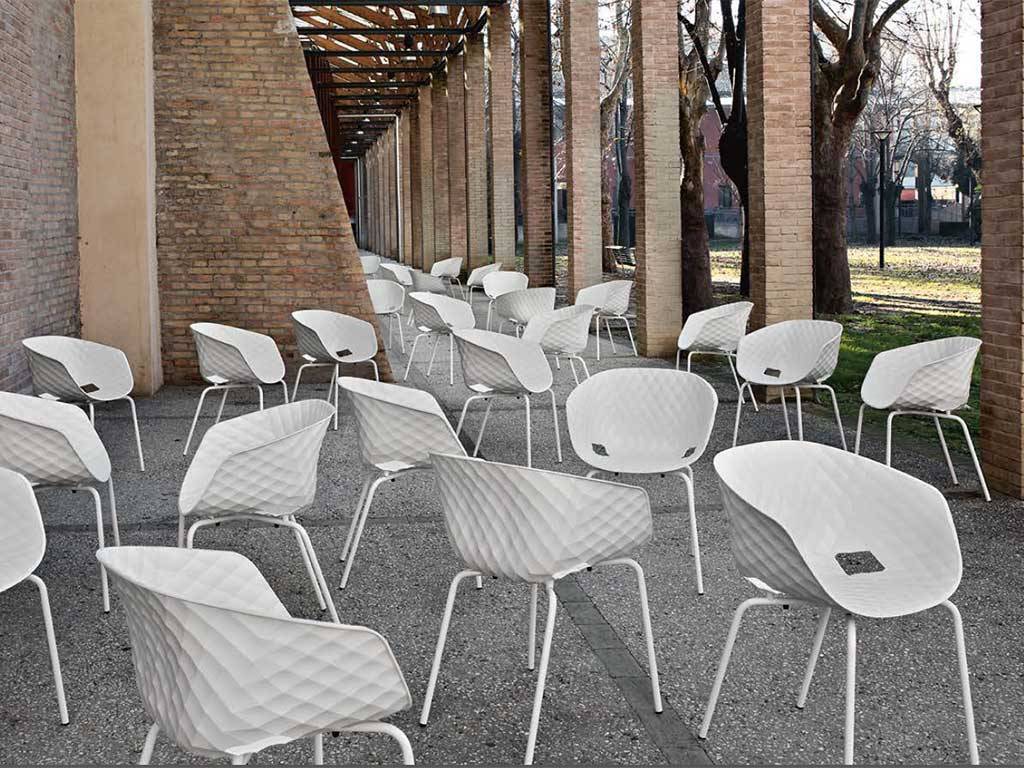 Seat in polypropylene available in 10 colors. 4 legs frame in varnished steel in the same color of the seat, shiny chromed or frosted. Texture padding effect on the front, with a glossy finish on the back.