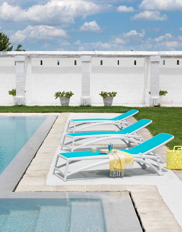 Sunbed with structure in polypropylene fiber glass and interior in synthetic fabric breathable and removable.