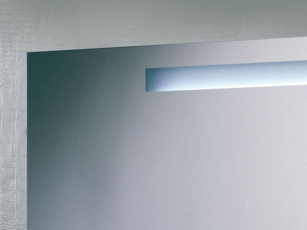 Mirror with blasted horizontal bands, backlit.Backed by electro galvanized steel frame painted white.