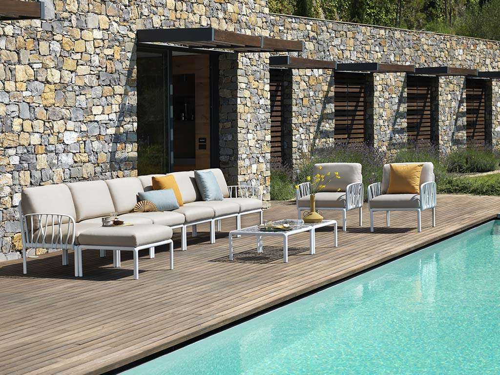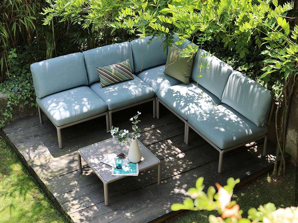 Modular upholstered seating system, sectional and configurable at will. The structure, inspired by the branches of the trees, characterizes the furniture and welcomes soft and colorful cushions in order to create your own open-air room.